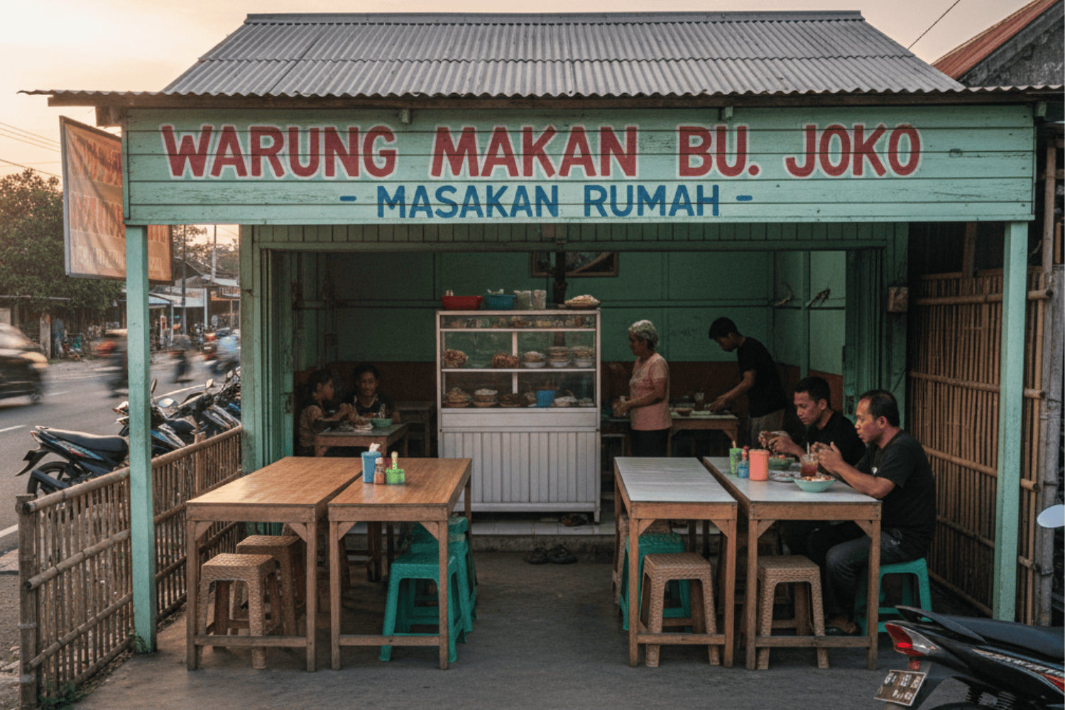 - Titik take-away terpisah: shelf kecil untuk pick-up delivery app, ditempatkan dekat pintu tetapi tidak mengganggu tamu dine-in.